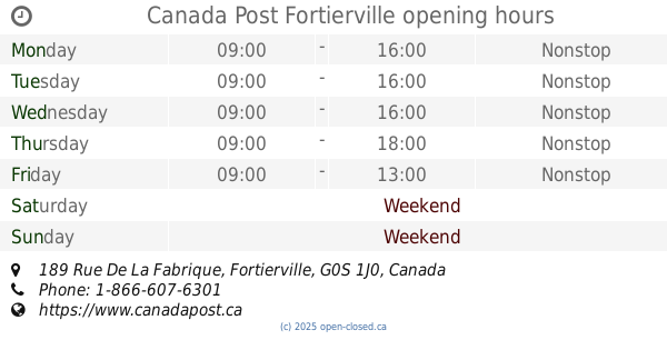 It is also possible to : Edit these OPENING HOURS of Branch Canada Post In Fortierville, 189 Rue De La Fabrique,
